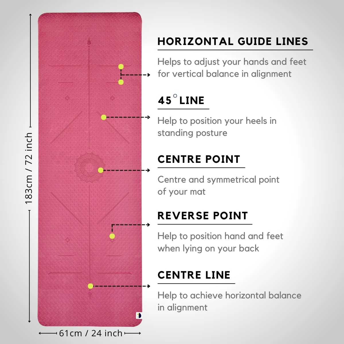 TPE Yoga Mat Double-Sided Non Slip with Alignment Lines, Size 72″x24″